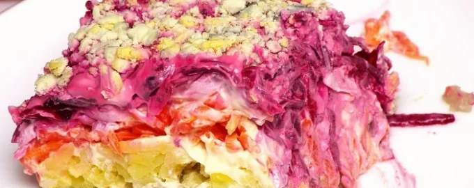 ترتیب واضح لایه ها یک هوی و هوس نیست، بلکه تضمین تعادل طعم است. موفق ترین ترکیب این است: سیب زمینی → پیاز → شاه ماهی → هویج → تخم مرغ → چغندر.