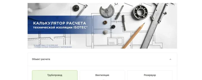 کافی است نوع تجهیزات عایق بندی شده (خط لوله، تهویه، مخزن) را انتخاب کنید، پارامترهای اساسی آن را تنظیم کنید، نوع عایق را مشخص کنید و با چه معیارهایی محاسبه انجام می شود. این سیستم ضخامت لایه مورد نیاز را تعیین می کند، عناصر بست کمکی بهینه را برای نصب آن پیشنهاد می کند و دمای سطح مورد انتظار و تلفات حرارتی تخمینی را نشان می دهد.